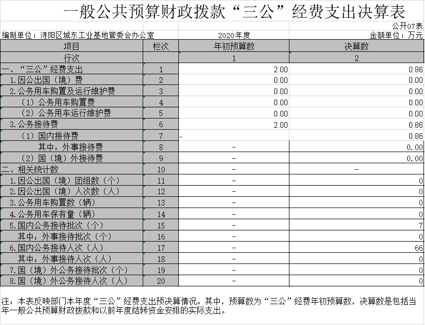 (二)公务接待费支出年初预算数为 2万元,决算数为0.85万元,完成预算的42%,决算数较2019年减少0.1万元下降11%,主要原因是减少公务接待次数。决算数较年初预算数减少的主要原因是:减少公务接待次数。全年国内公务接待7批,累计接待66人次,主要为:招商引资。