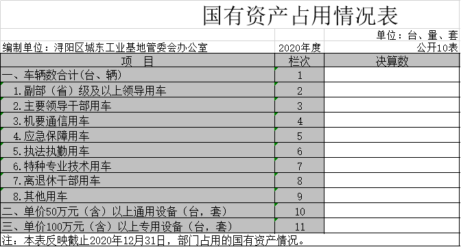 截至2020年12月31日,我办国有资产占用情况见公开10表《国有资产占用情况表》。我办共有车辆0辆;单位价值50万元以上通用设备0台(套);单位价值100万元以上专用设备0台(套)。
