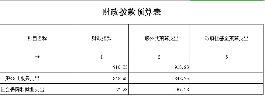 | 支出预算合计 | 916.23 | 其中:人员经费 | 594.28 | ||