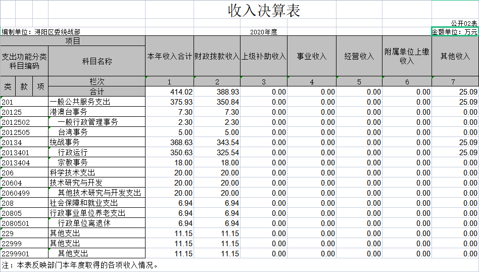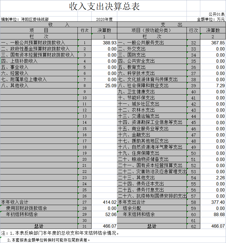 本部门2020年度收入总计466.07万元,其中年初结转和结余52.06万元,较2019年增加13.24万元,增长34.11%;本年收入合计414.02万元,较2019年增加231.51万元,增长126.85%,主要原因是:机构改革台办、民宗局人员并入统战部经费增加及补发2017年绩效经费。