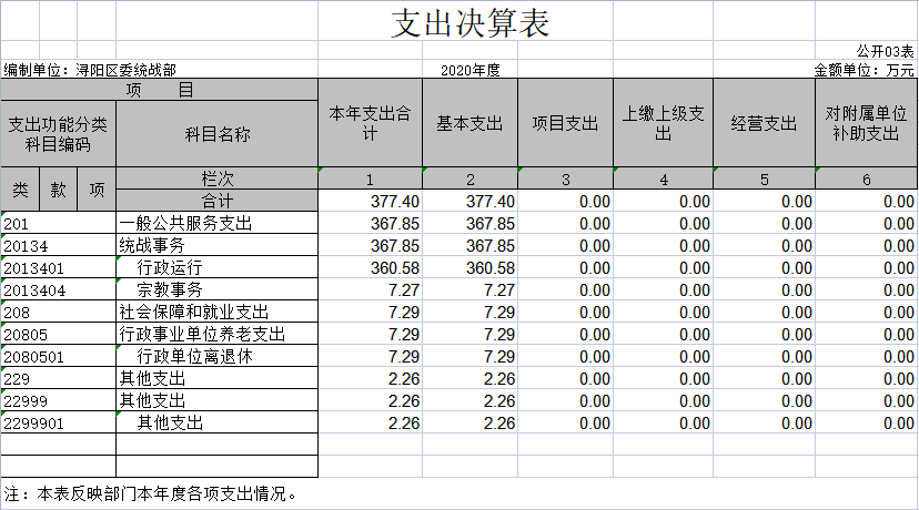 本部门2020年度支出总计466.07万元,其中本年支出合计 377.40万元,较2019年增加203.92万元,增长117.55%,主要原因是:机构改革台办、民宗局人员并入统战部经费增加及补发2017年绩效经费;年末结转和结余88.68万元,较2019年增加40.83万元,增长85.33%,主要原因是:公务经费实行厉行节约。