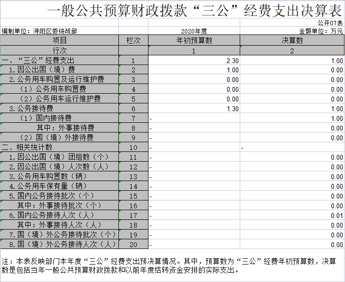 本部门2020年度一般公共预算财政拨款“三公”经费支出年初预算数为2.3万元,决算数为1万元,完成预算的43.48%,决算数较2019年减少0.33万元,下降24.81%,其中: