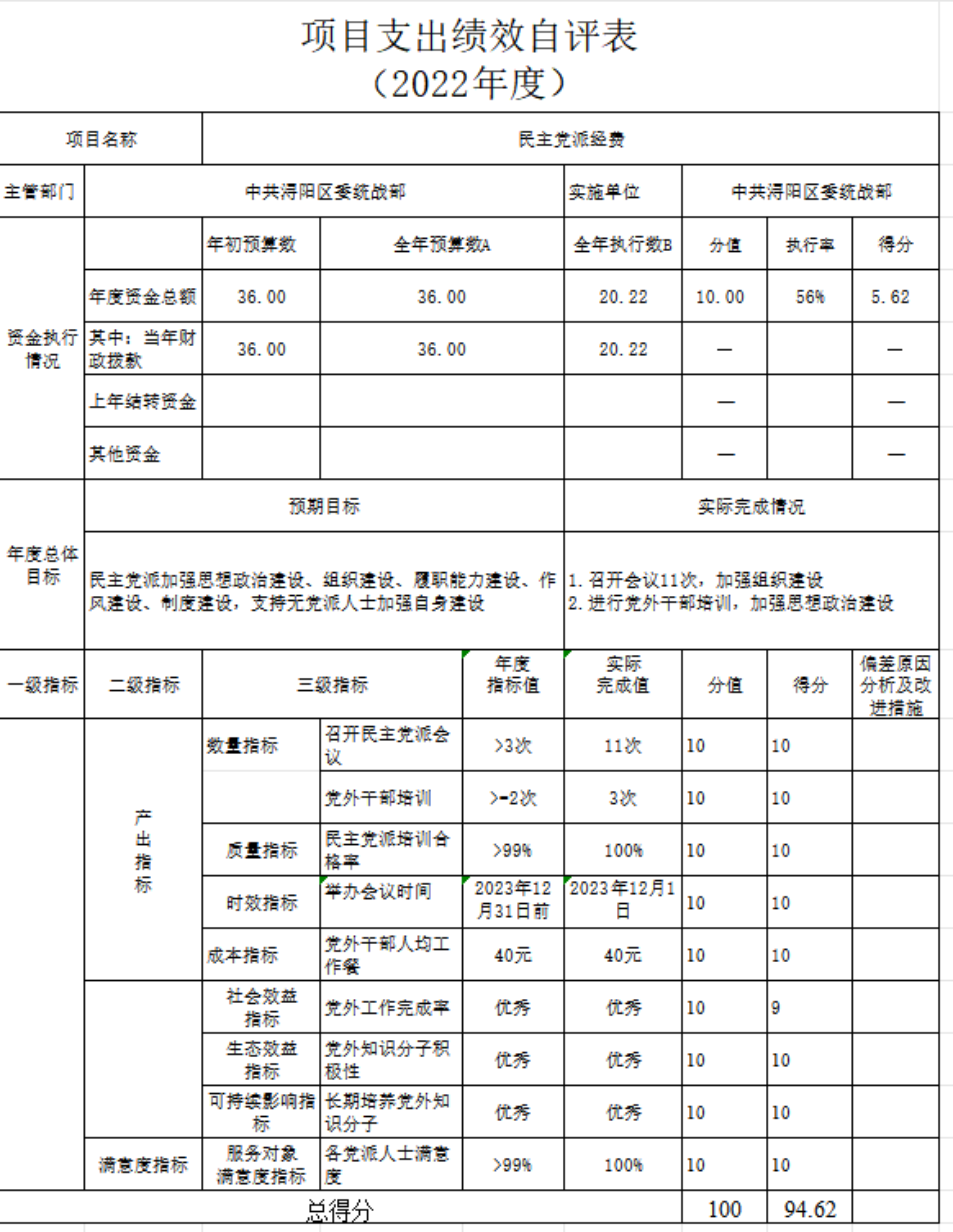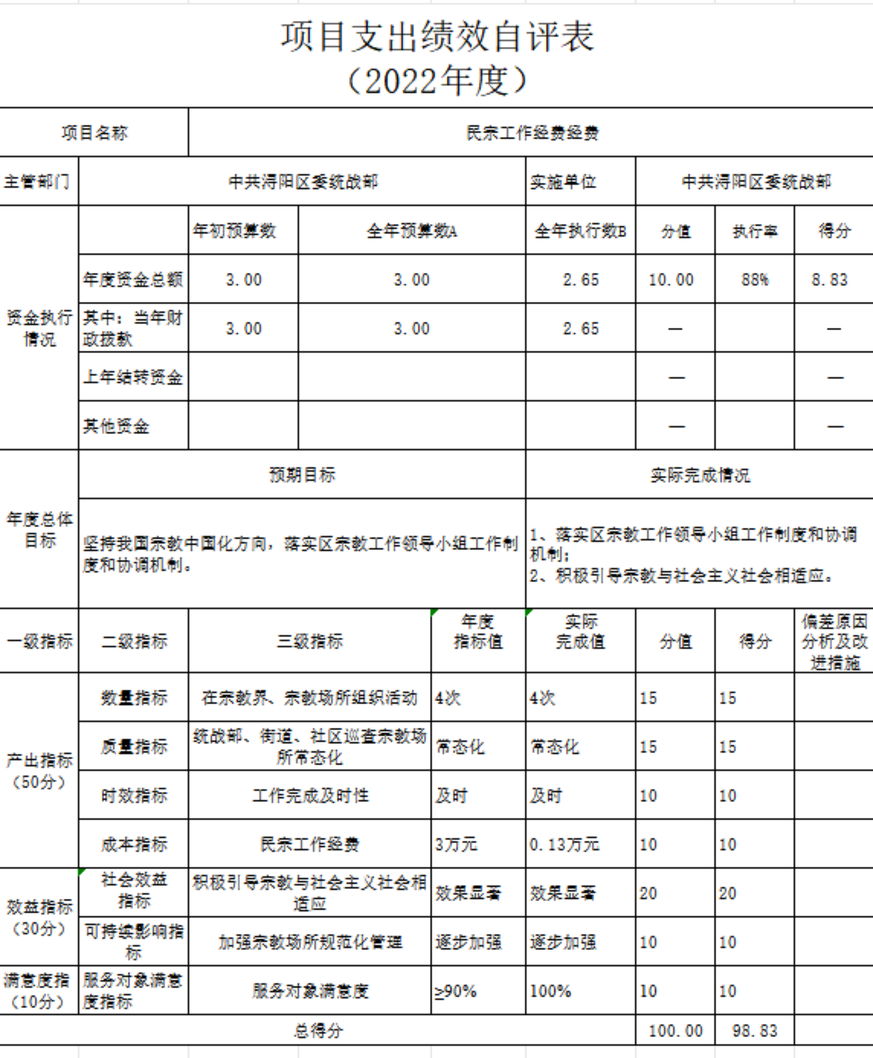 本次部门开展绩效自评民宗工作项目全年预算数3万元,本部门预算项目支出总额(执行数)为2.65万元,开展绩效自评项目支出总额占本部门预算项目支出总额的比例88.33%,自评价加权平均分99.49分,自评价结果“优”。中共浔阳区委统战部2022年度部门预算项目完成情况优秀,较好地实现了项目的年初绩效目标。