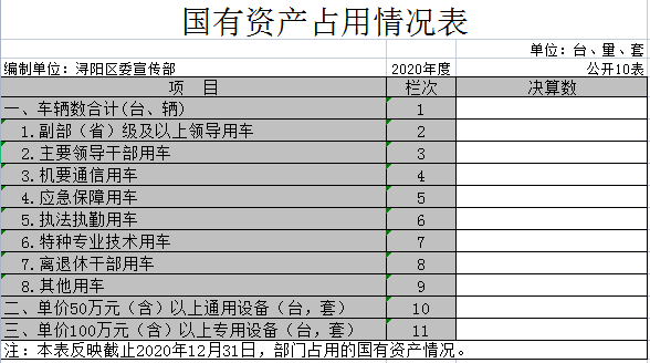 截至2020年12月31日,本部门(单位)国有资产占用情况见公开10表《国有资产占用情况表》。其中车辆中的其他用车主要是自公车改革后,单位未保留公车,全部移交给机关事务局。