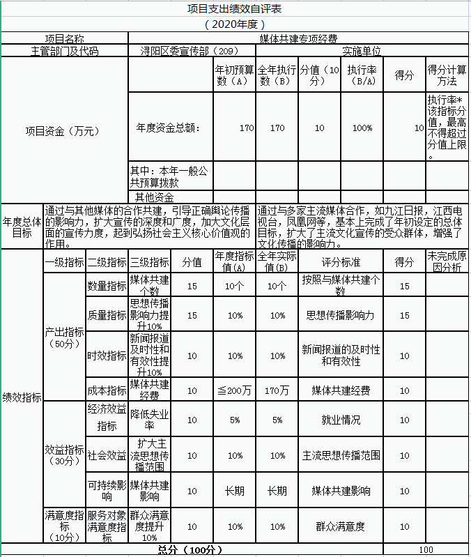 媒体共建专项经费项目绩效自评综述:根据年初设定的绩效目标,浔阳区委宣传部媒体共建专项经费项目绩效自评得分为100分。项目全年预算数为170万,执行数为170万,完成预算的100%。媒体共建项目资金年初预计170万元,资金全部到位。项目资金实行严格的管理制度,坚持一笔一清,管理状况良好。主要产出和效果:一是媒体共建数量增加,新闻发布时效性提高,有利于主流思想的传播。二是增强了与其他媒体的交流互动,提升了浔阳区委宣传部的传播力、影响力和公信力,扩大了主流思想的传播范围。三是通过与多家主流媒体合作,如九江日报,江西电视台,凤凰网等,扩大了主流文化宣传的受众群体,提升了群众的满意度。在项目资金使用过程中,实行了严格的资金管理制度,对所有经费的使用严格执行财政管理制度的各项要求,2020年媒体共建专项中总体绩效目标和各项绩效指标均全部达标,总体上看完成度良好,未出现偏离绩效目标的情况。因此在整个项目中未发现任何的问题。