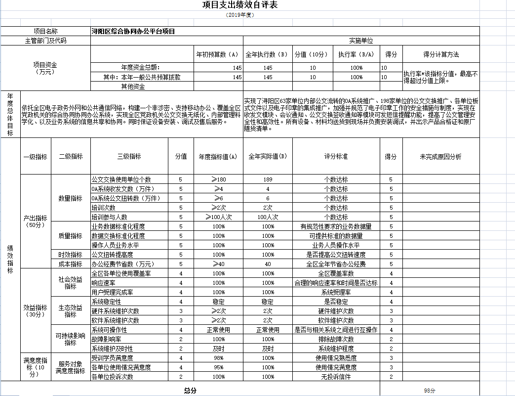 浔阳区综合协同办公平台项目绩效自评综述:根据年初设定的绩效目标,浔阳区综合协同办公平台项目项目绩效自评得分为98分。项目全年预算数为145万元,执行数为145万元,完成预算的100%。主要产出和效果:一是全年公文交换使用单位个数(包括二级部门)189个,OA系统收发文数达到4万件以上,公文扭转数达到6万件次,全区使用覆盖率达100%;二是开展培训2次,培训人数达到100人次以上,操作水平达100%;三是加强并规范了电子印章工作的安全措施与制度,实现在收发文模块、会议通知、公文交换签收通知等模块可发短信提醒功能,提高了公文管理安全性和高效性。四是实现全区党政机关公文交换无纸化、内部管理科学化、以及业务系统的信息共享和协同,为全区办公经费节省数达40万元以上。发现的问题及原因:各单位在使用情况满意度未达到预期目标,原因是各单位经办人员由于工作原因,工作岗位会经常变动,造成新接手的人员操作熟练度下降。下一步将定期开展培训和沟通。