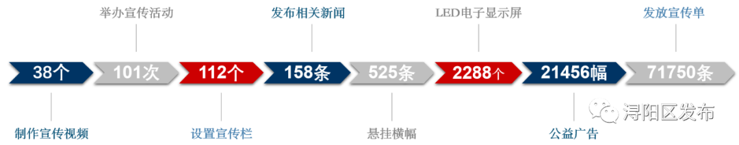 自2018年创建全国文明城市工作启动以来,全区共制作宣传视频38个,举办宣传活动101次,设置宣传栏112个,发布相关新闻158条,悬挂横幅525条,LED电子显示屏2288个,制作、更新刊播公益广告21456幅,发放宣传单71750张,线上线下宣传实现全覆盖,形成了“人人知晓创建、人人参与创建”的良好氛围。