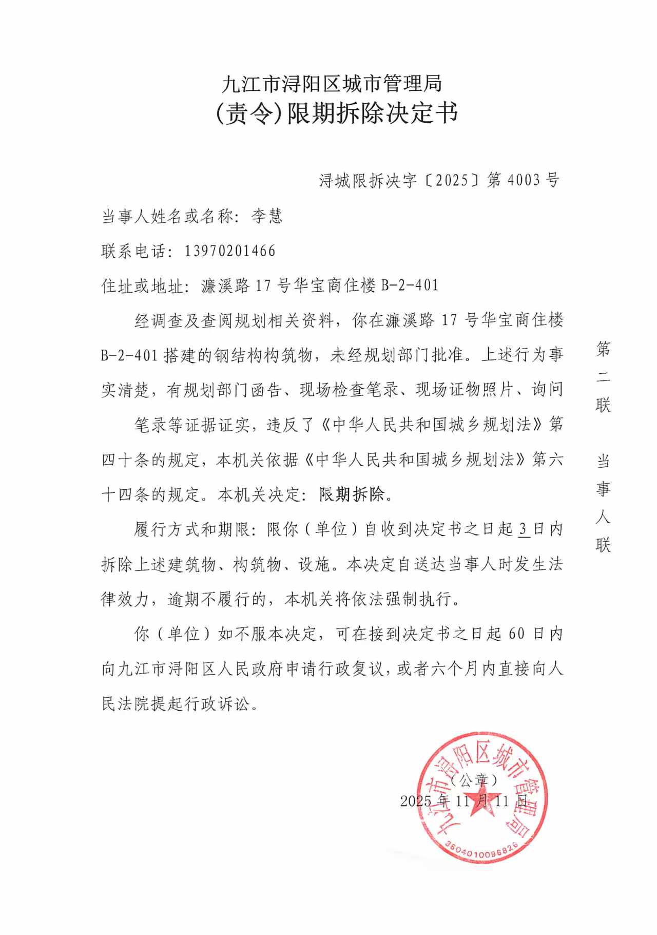 经直接送达、邮寄送达等方式,均无法向你送达《(责令)限期拆除决定书》,现依法公告送达,限你自本公告发出之日起60日内到浔阳区城市管理局湓浦中队领取,逾期即视为送达。