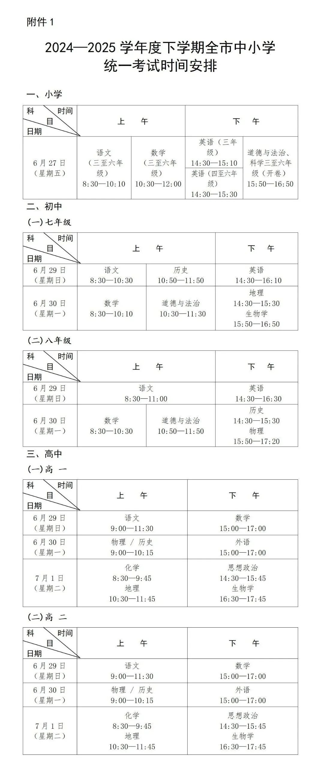 附件:1. 2024—2025 学年度下学期全市中小学统一考试时间安排