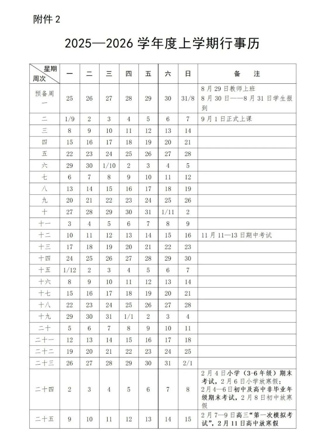 2. 2025—2026 学年度上学期行事历