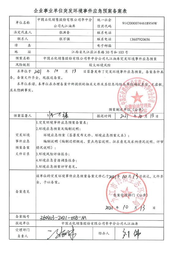 中国石化销售股份有限公司华中分公司九江油库突发环境事件应急预案