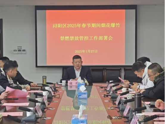 律回春渐,新元肇启。为进一步加强春节期间大气污染防治,确保人民群众度过一个安全、祥和、绿色的新春佳节,1月27日浔阳区开展一系列行动,全力推动春节期间烟花爆竹禁燃禁放大气污染防治攻坚工作。1月27日上午,浔阳区在区政府召开2025年春节期间烟花爆竹禁燃禁放管控工作部署会,浔阳区政府副区长戴勇主持会议,区公安、城管、应急、市监、住建、生态环境、辖区各街道等相关单位主要领导参会。