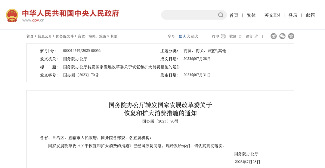 7月31日,国务院办公厅转发国家发展改革委关于恢复和扩大消费措施的通知。