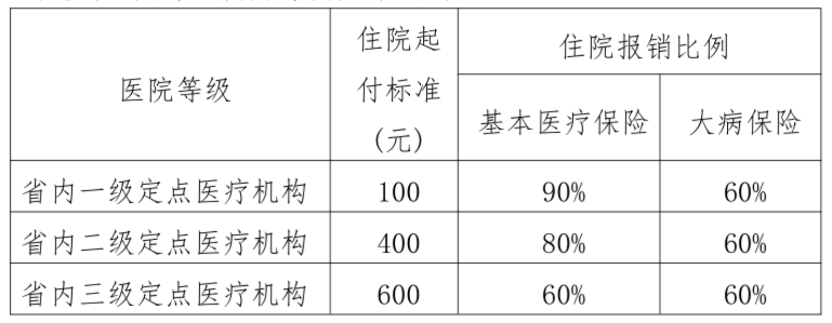三是住院费用:住院发生的政策范围内的医疗费用,个人先行自付住院起付标准后,再按住院支付比例由基本医疗保险住院统筹和大病保险支付。见下表: