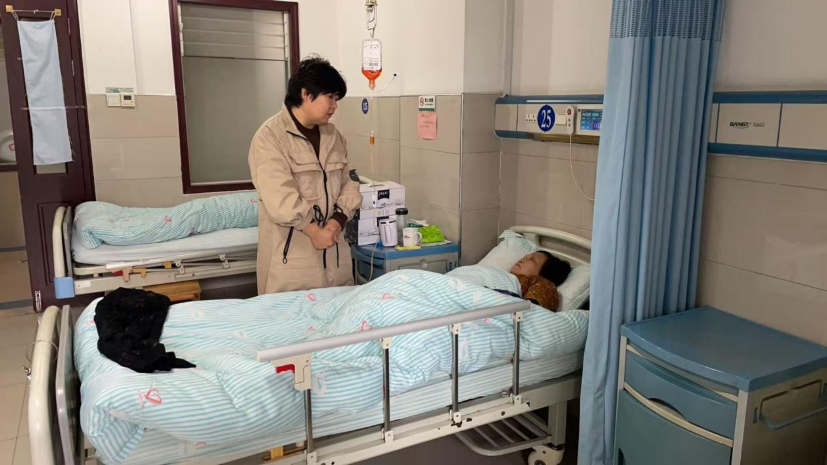 在病房里,社区书记与工作人员为老人送上了牛奶,并详细询问了她的身体状况和治疗进展。并且细心为老人整理床铺,耐心倾听她的生活需求,还与主治医生深入沟通,协助优化后续康复方案。