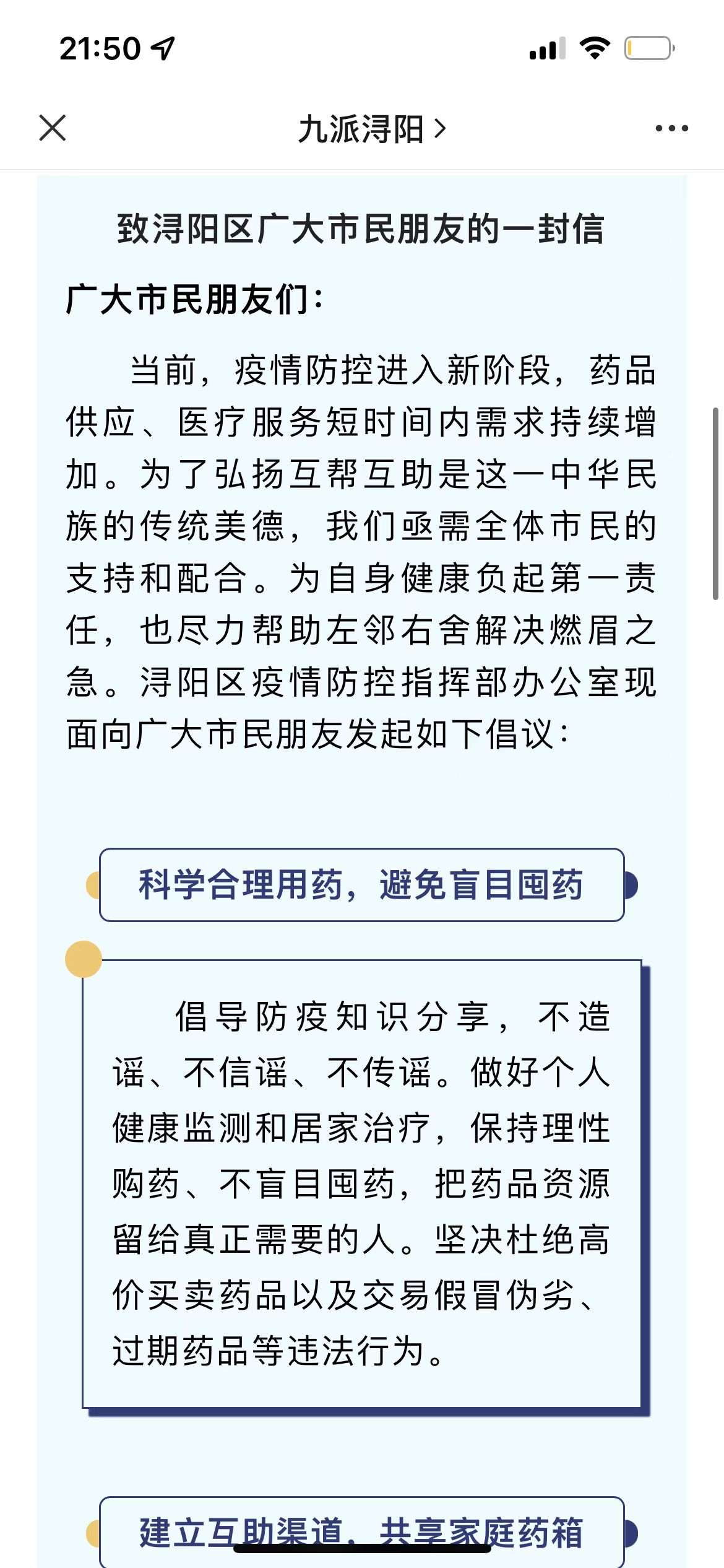 12月25日,浔阳区向社会面发布了《致浔阳区广大市民朋友的一封信》,并在全区范围内设置共享药箱200余个,从而盘活社会面抗疫资源,实现邻里之间守望互助的效果。鼓励市民群众在当前的特殊时期以交换或赠予的方式,自发将家里多余的各类药品拿出来,通过共享药箱分享给有急需或者行动不便的邻居。由社区对共享药箱进行统筹管理,将共享药品的名称、数量等信息登记后妥善保存,一旦有居民需要,经过社区工作人员及志愿者对接核实,就会第一时间把药品送到居民手中。“共享药箱”的设立让社区“居民群”变成“互助群”,拉近了邻里之间的情感距离,也汇聚起了党群同心、守护健康的强大力量。