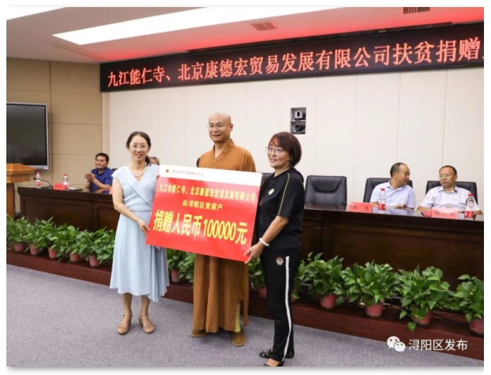 ▲2020年8月8日下午,九江能仁寺、北京康德弘贸易发展有限公司负责人一行赴浔阳区开展扶贫捐赠暨发放仪式