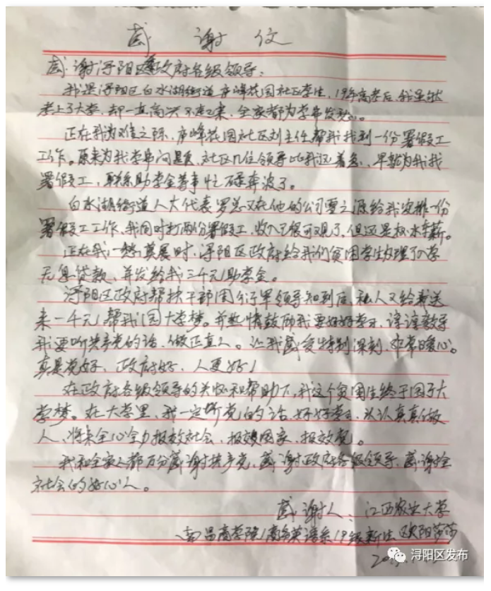 ▲2019年“爱满浔阳·慈善助学”助学活动结束后,时隔3个月,江西农业大学南昌商学院的一名19级大一新生欧阳莎莎,向浔阳区委、区政府送来了一封感谢信,她曾是2019“爱满浔阳·慈善助学”助学活动中受助的一名贫困生,在区委、区政府的关怀下,她终于圆了自己的大学梦。