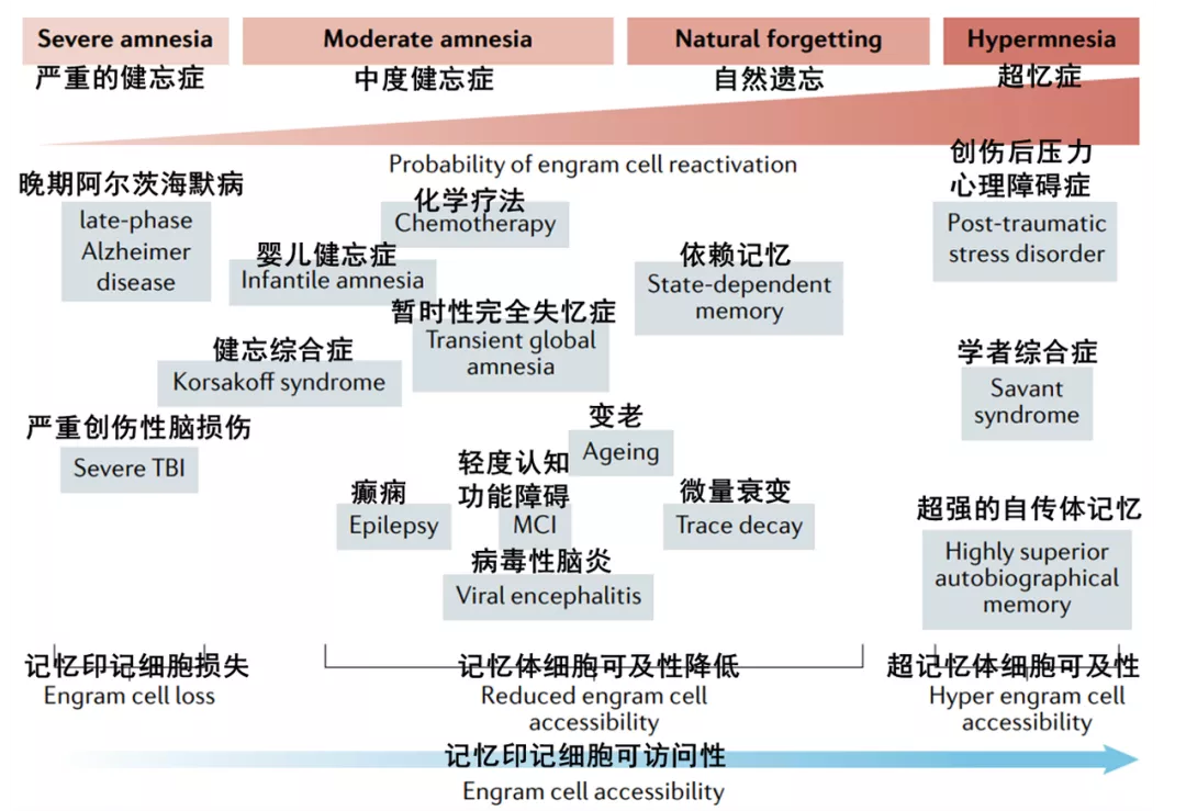 研究人员在健忘症小鼠模型中探讨了记忆印记细胞的可及性(即遗忘的东西可以恢复)与病理遗忘之间的关系以及遗忘相关的机制。研究发现,自然遗忘与以下四个机制有关: