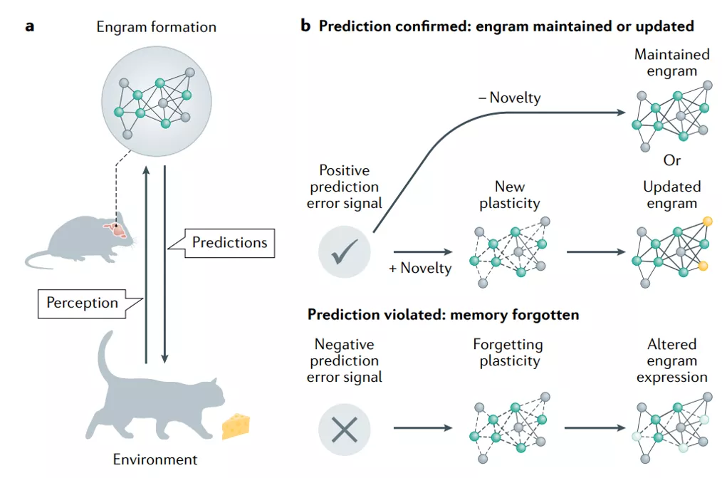 图|遗忘是适应性神经可塑性的一种形式。a. 根据本文中概述的模型,动物(在本次试验中是小鼠)由于它们的经验和对世界的感知而形成记忆印记;b. 当记忆被回忆,预测被确认,一个正向的预测错误信号发生,因此记忆被保持,或者如果有显著的(新颖的)相关信息作为新的学习和可塑性的结果被更新。(来源:该论文)