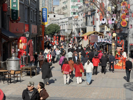 春节期间,浔阳区聚焦文旅消费新业态培育,打造多元沉浸式体验场景,让传统景区焕发新活力。大中路(洋街)依托“欢乐九江GO”主题活动,汇聚民俗展演、非遗美食、NPC互动等多元业态,青砖黛瓦的百年街巷与霓虹光影交相辉映,60余家餐饮商户同步入驻,本土非遗小吃、网红商户日均营业额超2万元,假期人流量达35.5万人次,成为展示浔阳文化韵味的核心阵地。