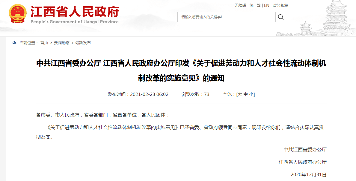 2月23日,江西省人民政府官网发布江西省委办公厅、江西省人民政府办公厅联合印发的《关于促进劳动力和人才社会性流动体制机制改革的实施意见》(下称《实施意见》),通过优化户籍制度和公共服务,激发社会性流动活力。