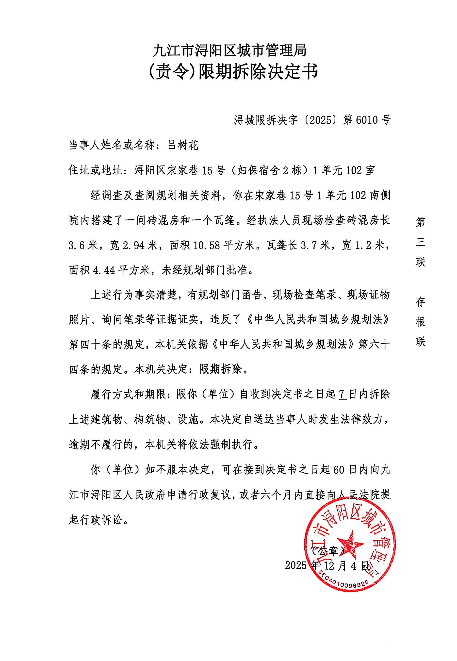 《(责令)限期拆除决定书》送达公告-吕树花