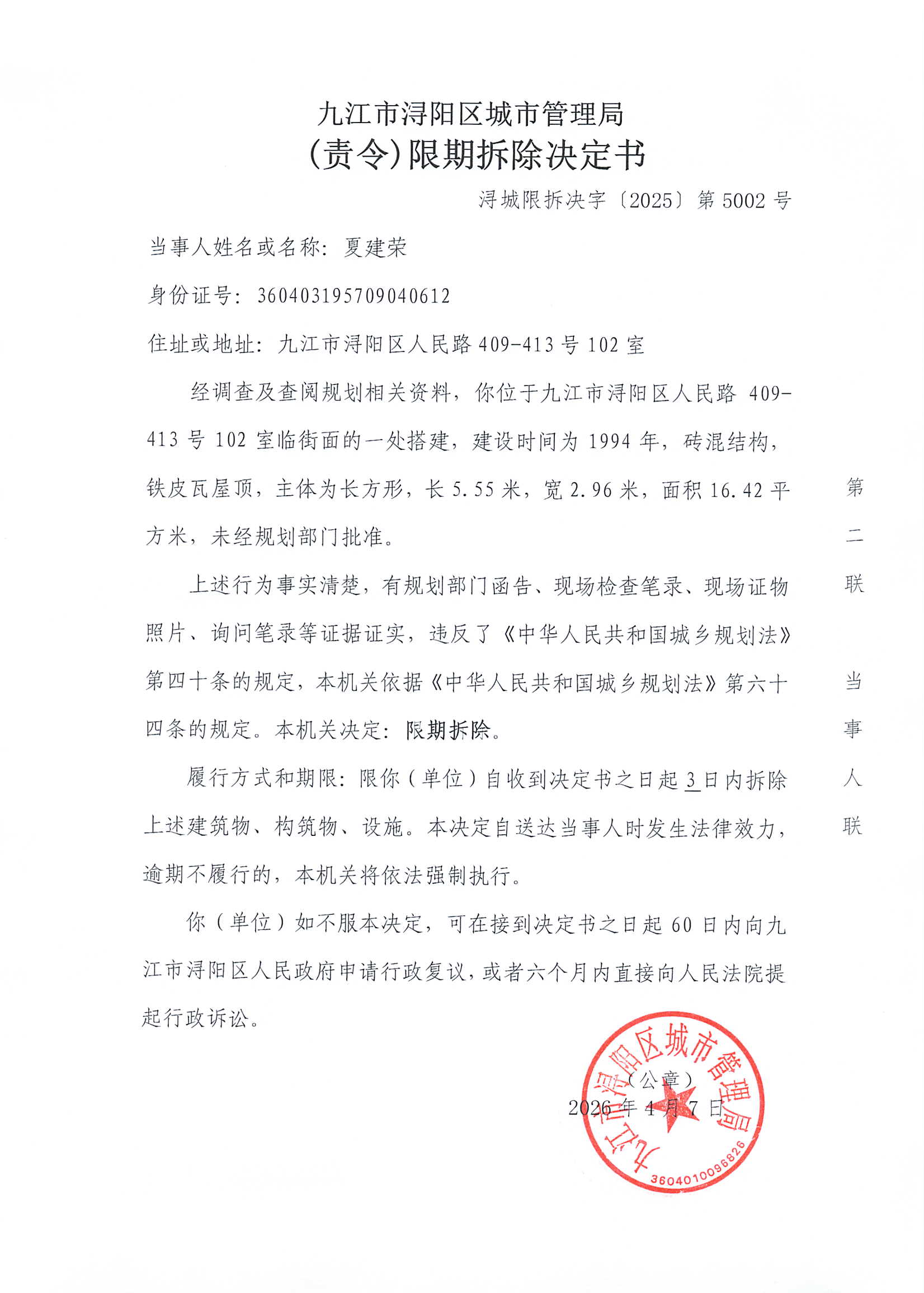 《(责令)限期拆除决定书》送达公告-夏建荣