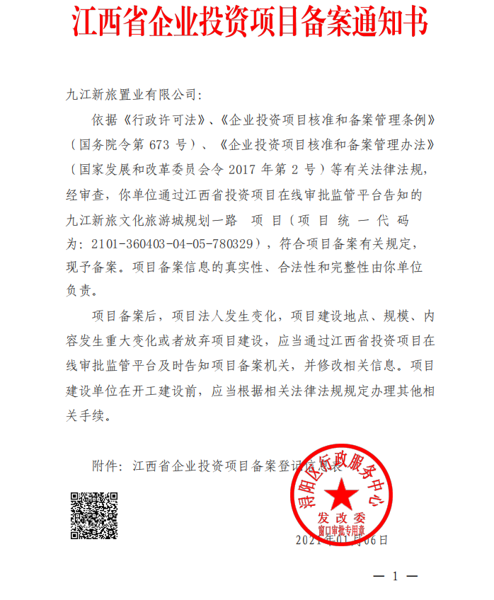 九江新旅置业有限公司九江新旅文化旅游城规划一路项目备案批复