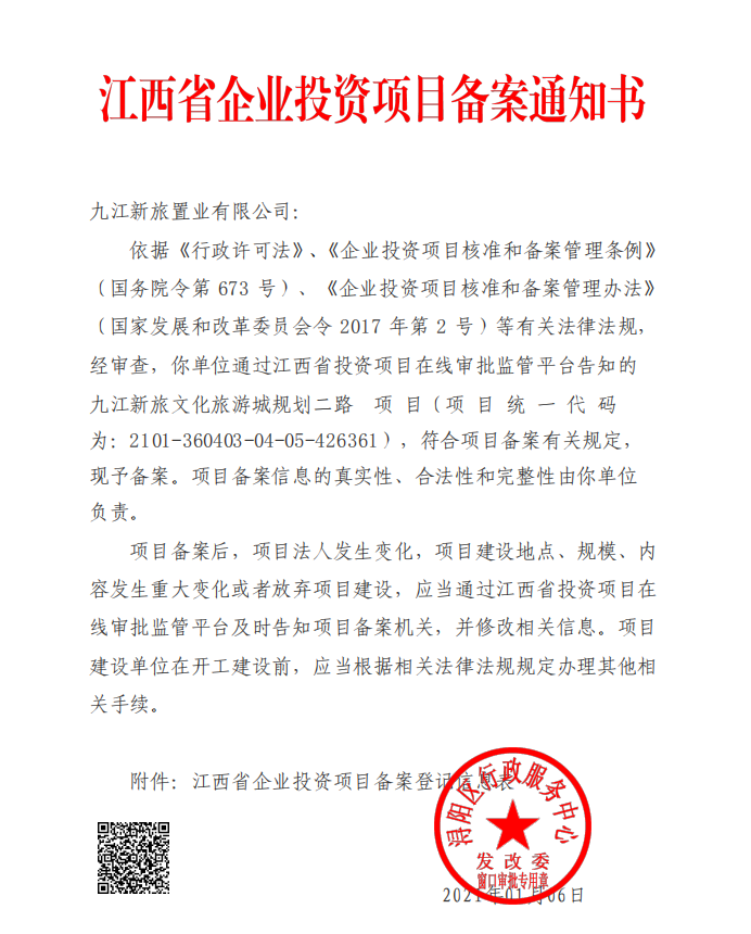 九江新旅置业有限公司九江新旅文化旅游城规划二路项目备案批复