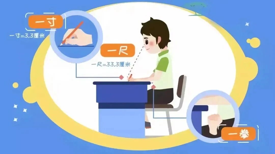 保持正确读写姿势,牢记“三个一”:阅读书写时,桌椅高度要适宜,做到眼睛离书本一尺(约33厘米)、胸口离桌沿一拳(约10厘米)、握笔手指离笔尖一寸(约3厘米)。