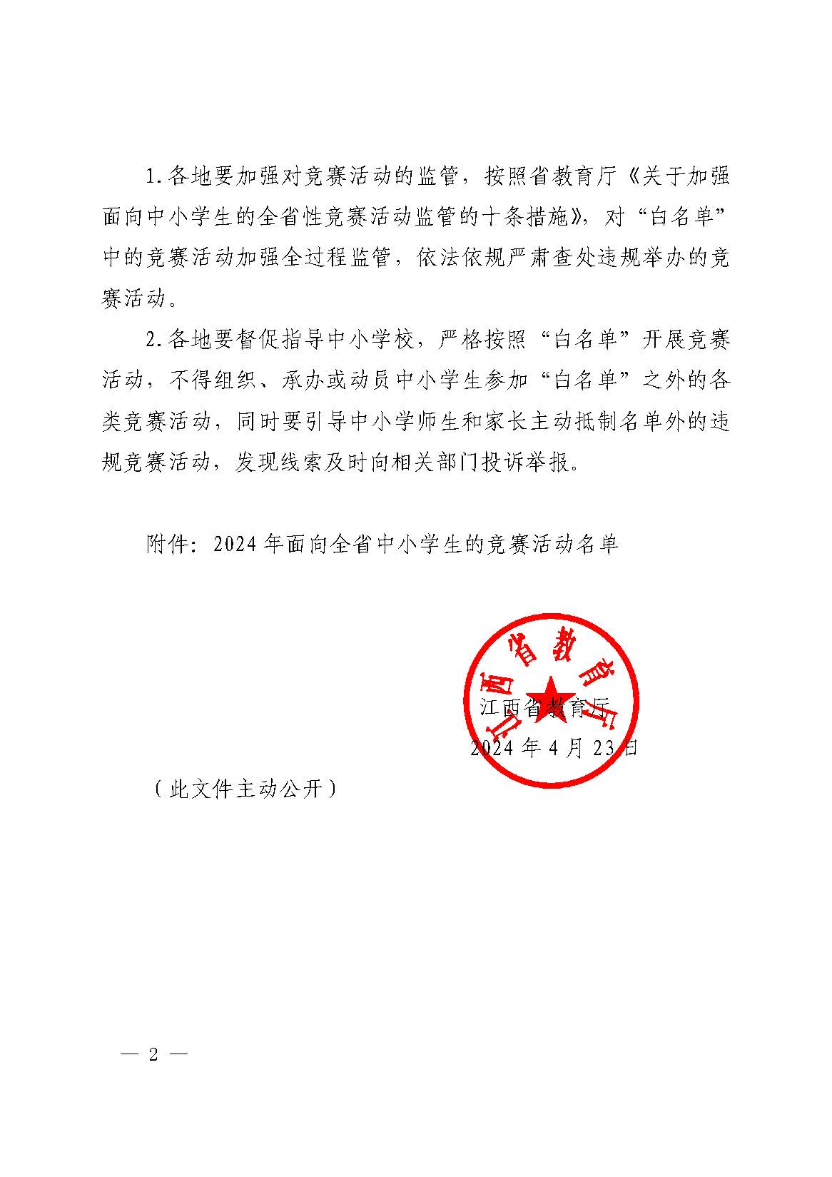 为规范中小学生竞赛活动,近期,省教育厅印发了《关于公布2024年面向全省中小学生的竞赛活动名单的通知》,现将文件转发给你们,请各地各校按照文件要求抓好贯彻落实。同时,各县(市、区)教育行政部门要进一步规范竞赛管理工作,加强对竞赛活动的全过程监管,维护良好育人环境。