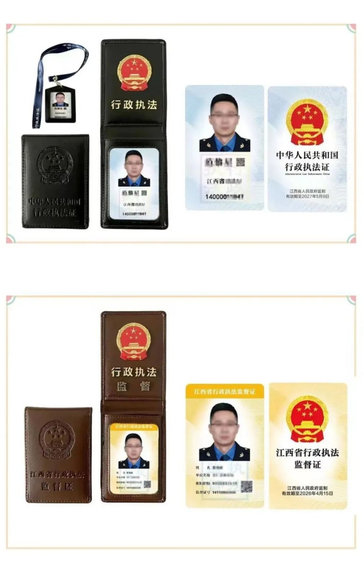 三、《执法证》和《监督证》由省司法厅统一制作,严禁行政执法机关违法制作。任何单位和个人可以登录江西省行政执法证件公示平台(https://xzzf.jxsf.gov.cn:8443)或者扫描证件上的二维码对《执法证》和《监督证》的有效性进行查询。
