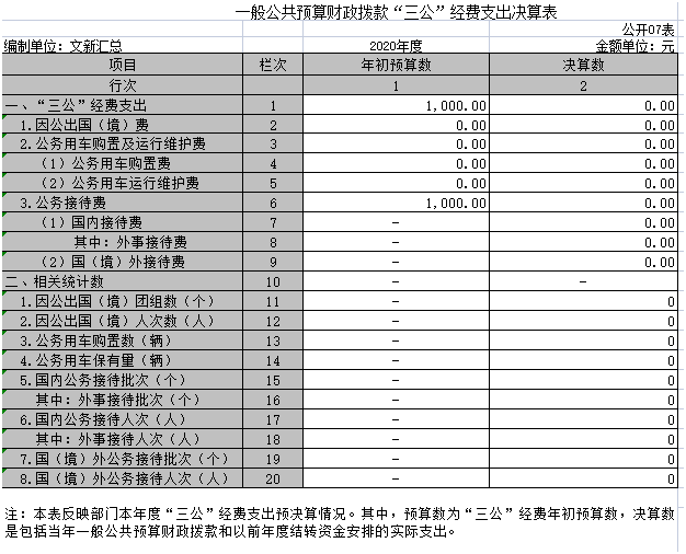 本单位2020年度一般公共预算财政拨款“三公”经费支出年初预算数为0.1万元,决算数为0.00万元,完成预算的0%,决算数较2019年无变动,其中: