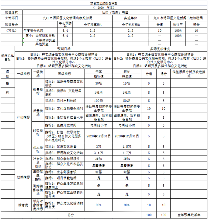 项目绩效自评总体综述:根据年初设定的绩效目标,社区(农家)书屋项目绩效自评得分为 100 分。项目全年预算数为 6.4 万元,执行数为 3.2 万元,完成预算的 50 %。项目绩效目标完成情况:一是夯实综合性文化服务中心基础设施建设;二是提升基层公共文化服务效能,打造5个示范村(社区)综合性文化服务中心,三是组织开展多样性群众文化活动。发现的问题及原因:一是大部分社区(农家)书屋的图书急需更新;二是加强书屋管理人员建设。下一步改进措施:一是加大图书更新投资;二是培训图书管理员。