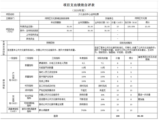 根据区财政局《关于开展2020年度预算项目、部门整体支出及转移支付预算执行情况绩效自评工作的通知》(浔财字〔2021〕17号)所附的《项目支出绩效自评表》以及《九江市财政绩效评价指标汇编》进行评价,自评得分96分。