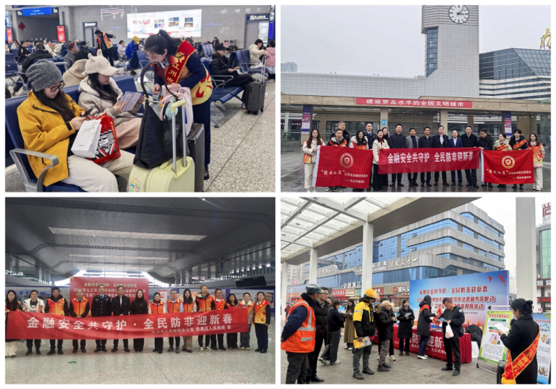 2月5日下午,九江市人民政府办公室携手九江金融监管分局、市公安局、濂溪区人民政府、柴桑区人民政府、九江农商银行以“金融安全共守护·全民防非迎新春”为主题,以党建为引领,在九江站、庐山站同步开展防范非法金融市区联动“五进”之进交通枢纽启动活动,为返乡旅客筑牢财产安全防线。市政府办公室副主任龚飞同志,市政府发展研究中心副主任王欢同志出席活动并指导工作。