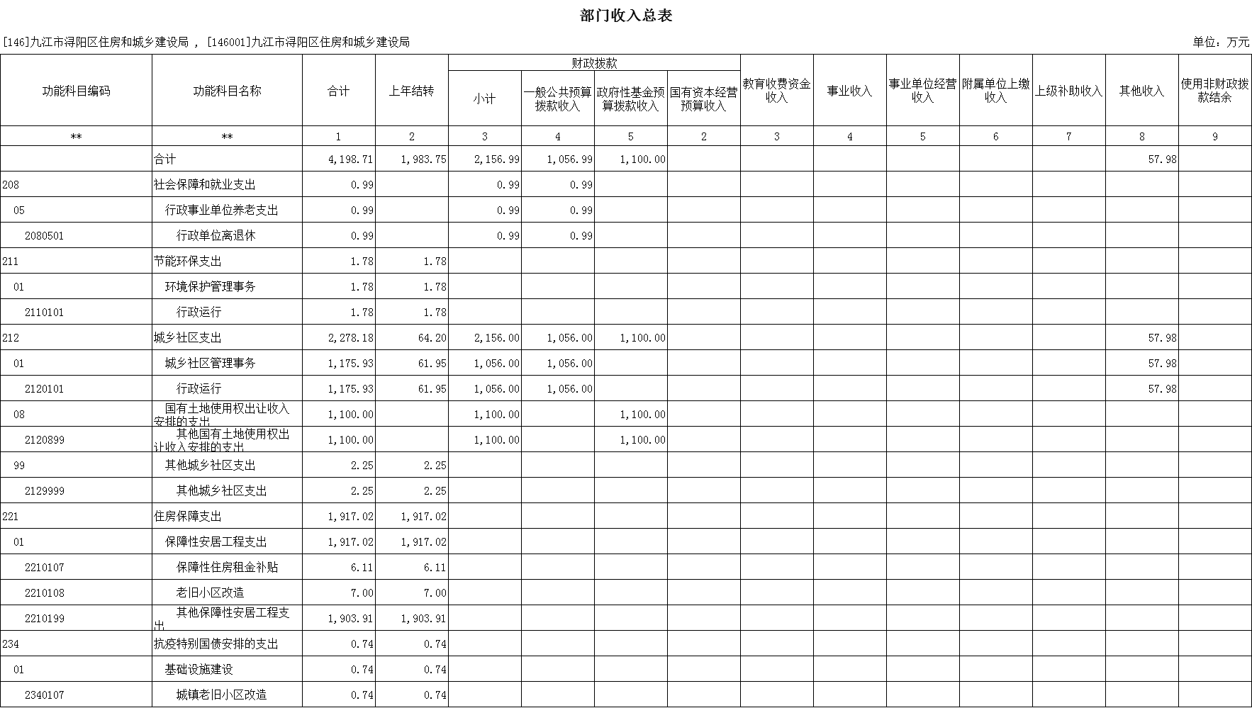 按支出功能科目划分:社会保障和就业支出0.99万元,节能环保支出1.78万元,城乡社区支出2278.18万元,住房保障支出1917.02万元,抗疫特别国债安排支出0.74万元。