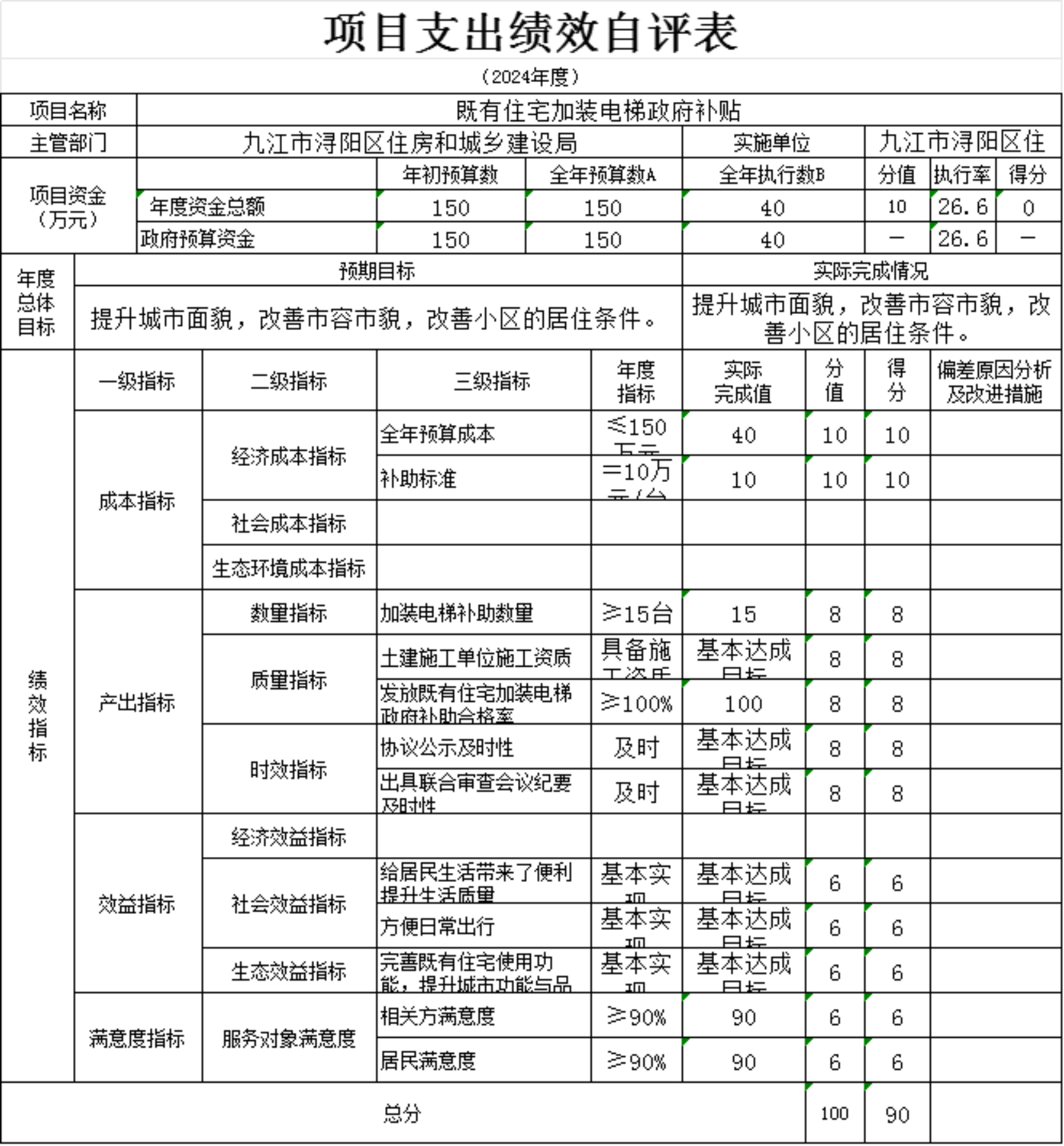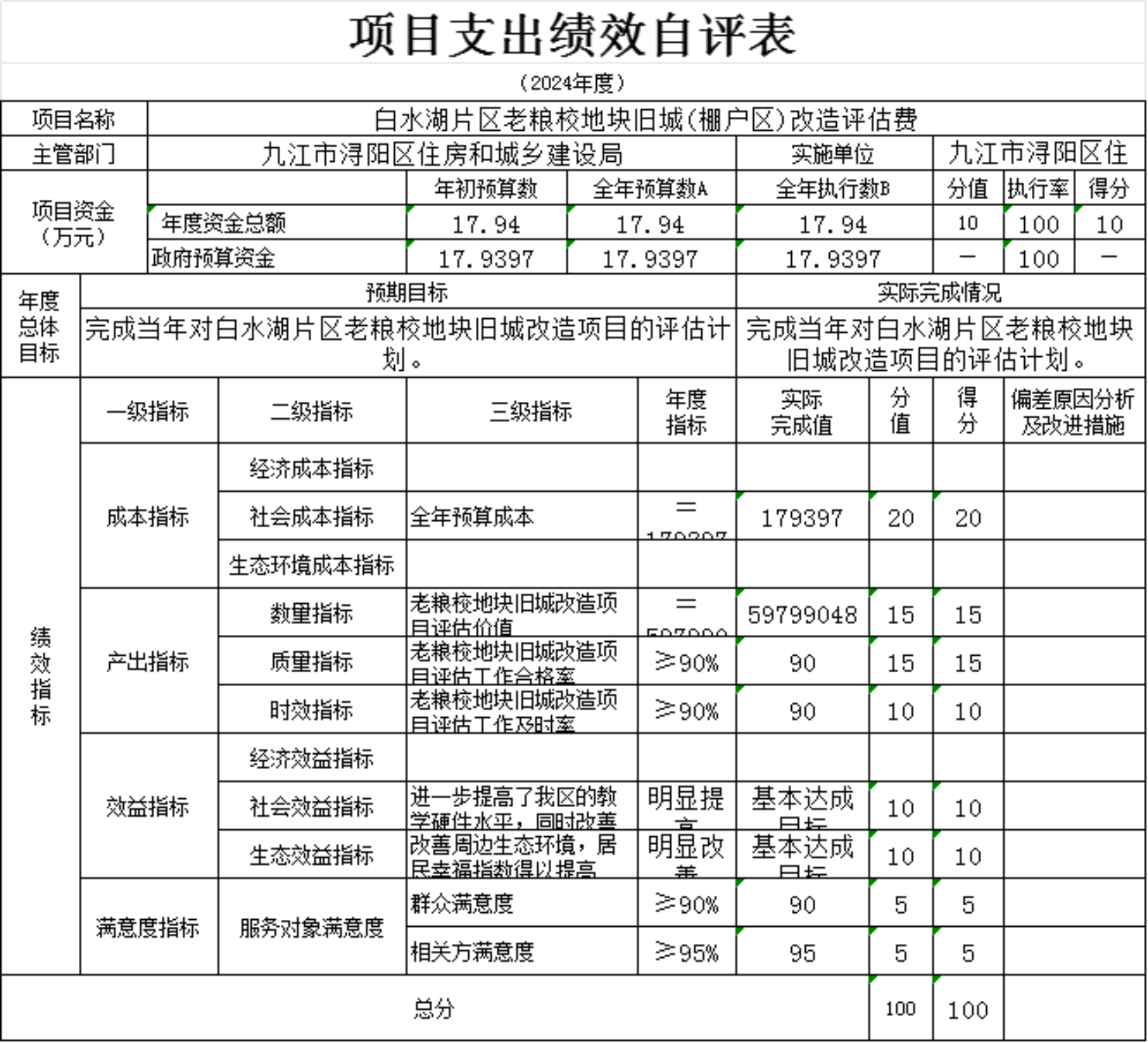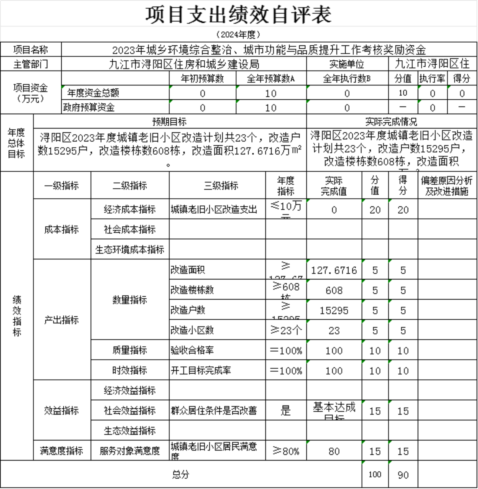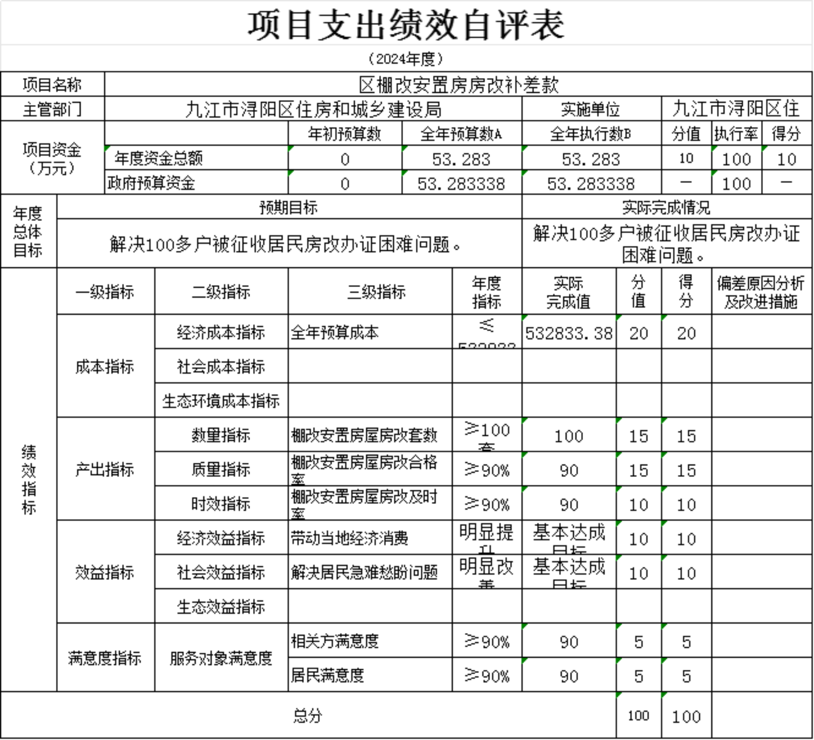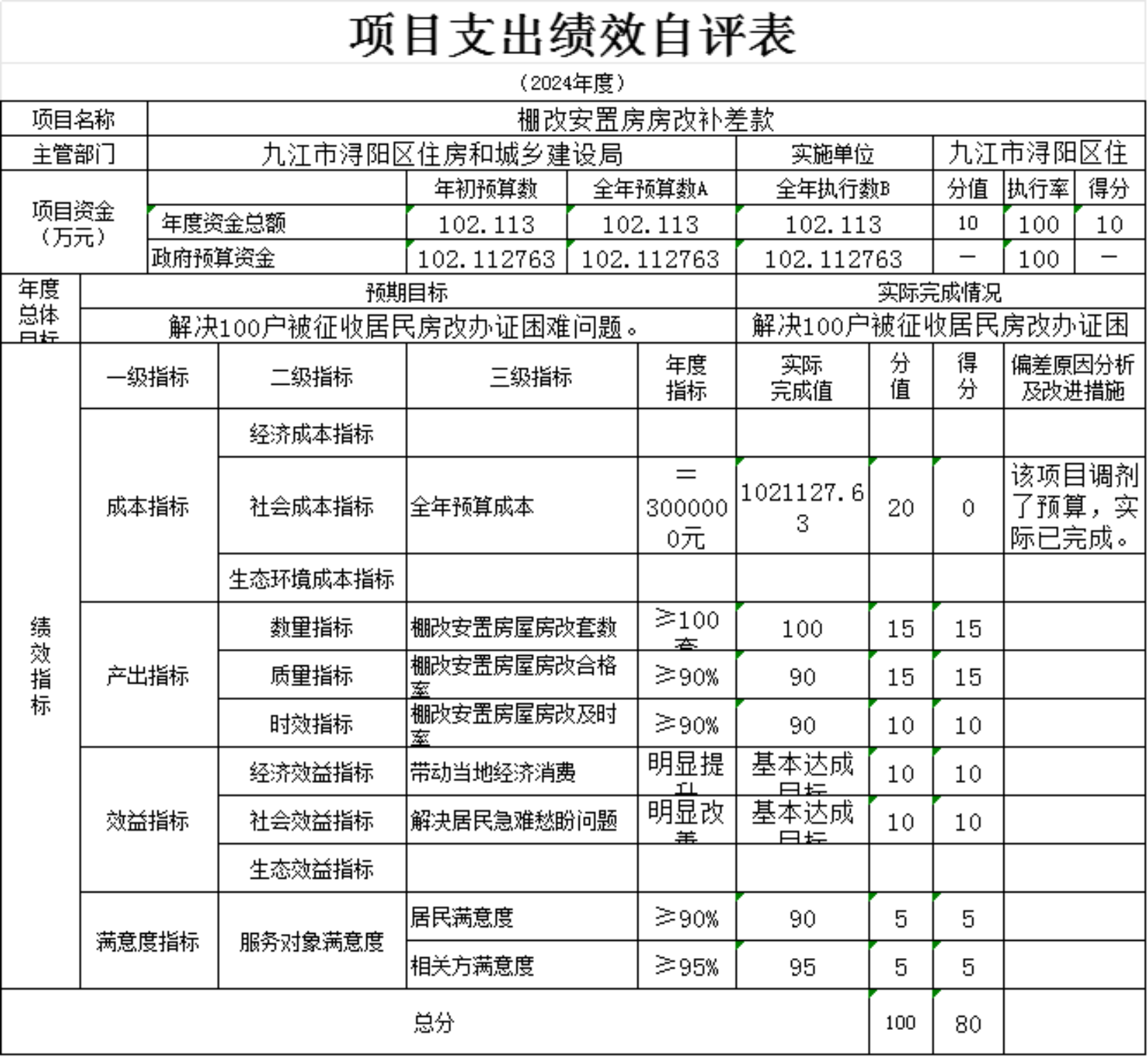 为贯彻落实中央、省、市关于全面实施预算绩效管理的要求,加强区预算绩效管理,提高财政资金使用效益,根据江西省财政厅关于印发《江西省省级项目支出和部门整体支出绩效评价管理暂行办法》的通知(赣财绩〔2022〕9号)、中共浔阳区委 浔阳区政府印发<浔阳区关于全面实施预算绩效管理的实施办法>》(浔发〔2020〕5号)等文件精神,对本单位棚改安置房房改补差款项目支出进行了绩效自评,现将自评情况报告如下: