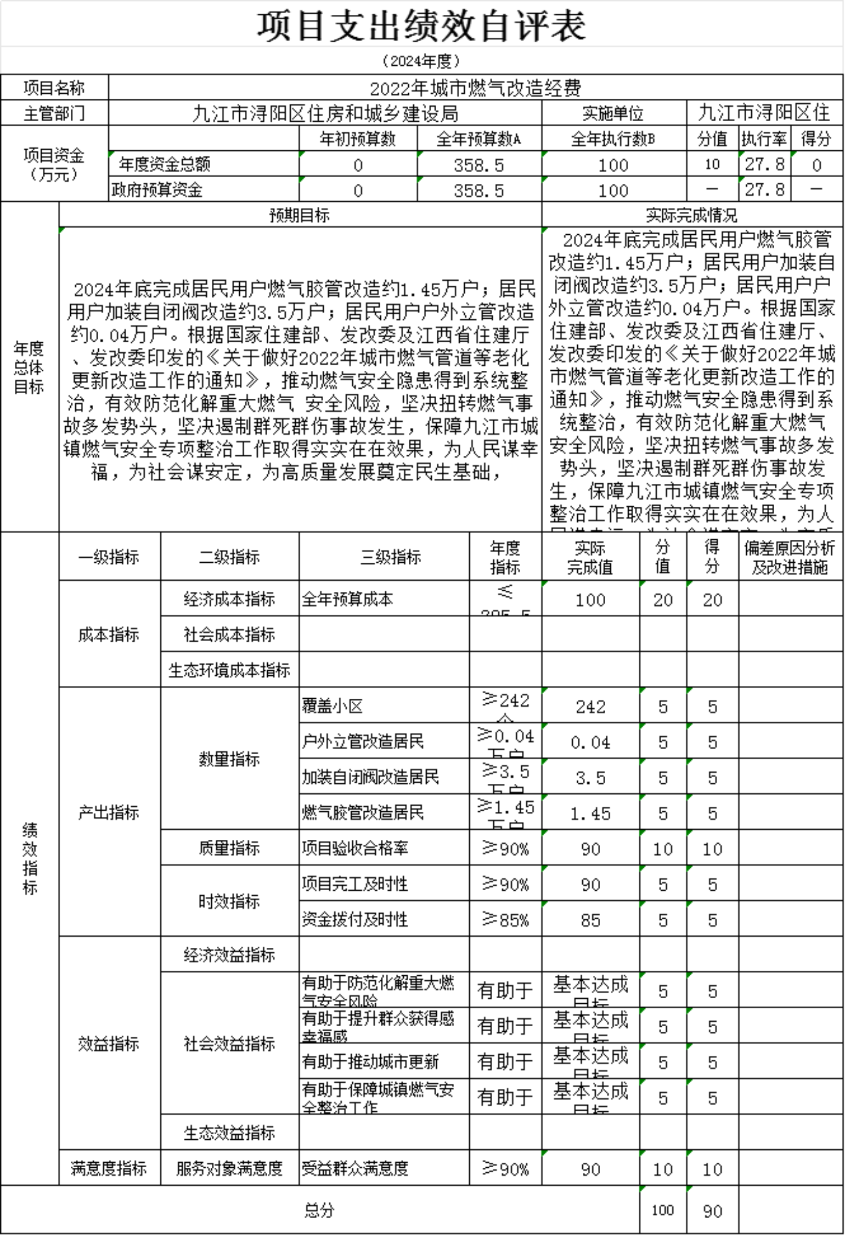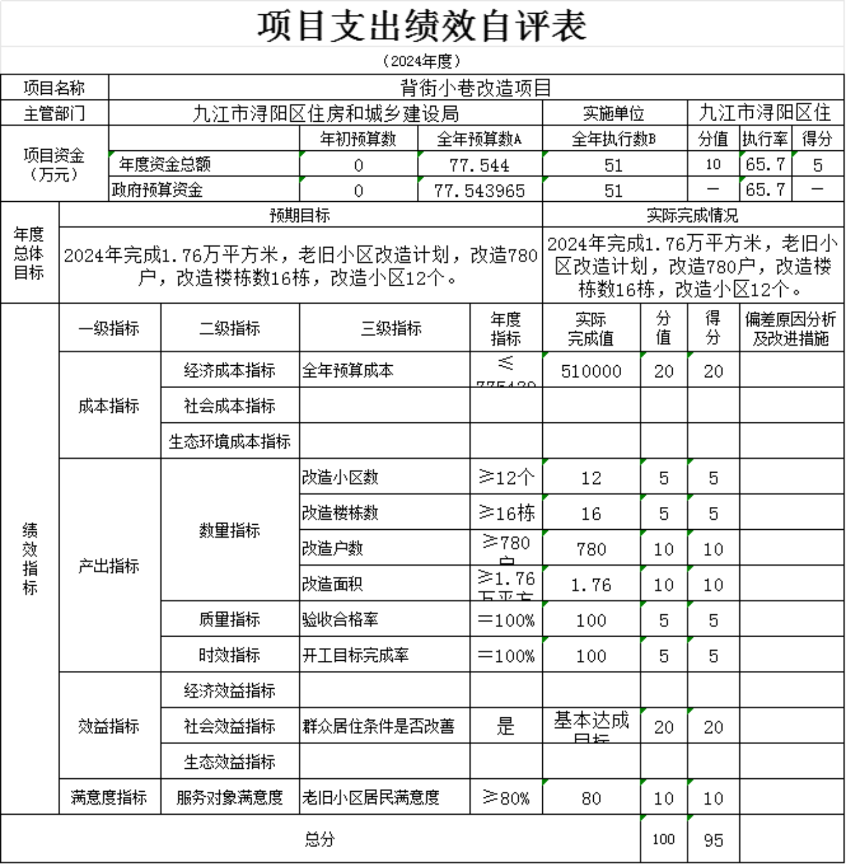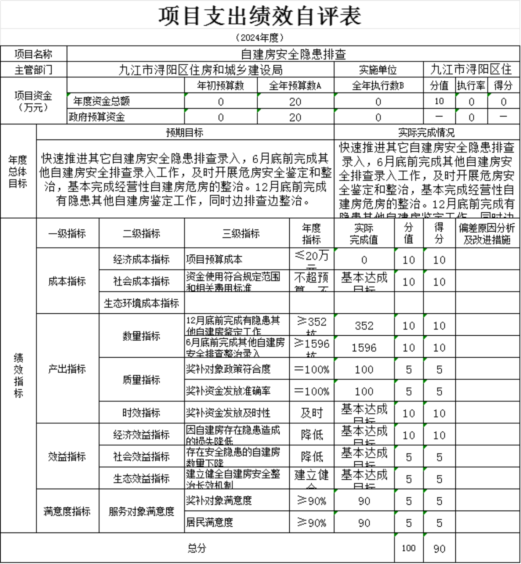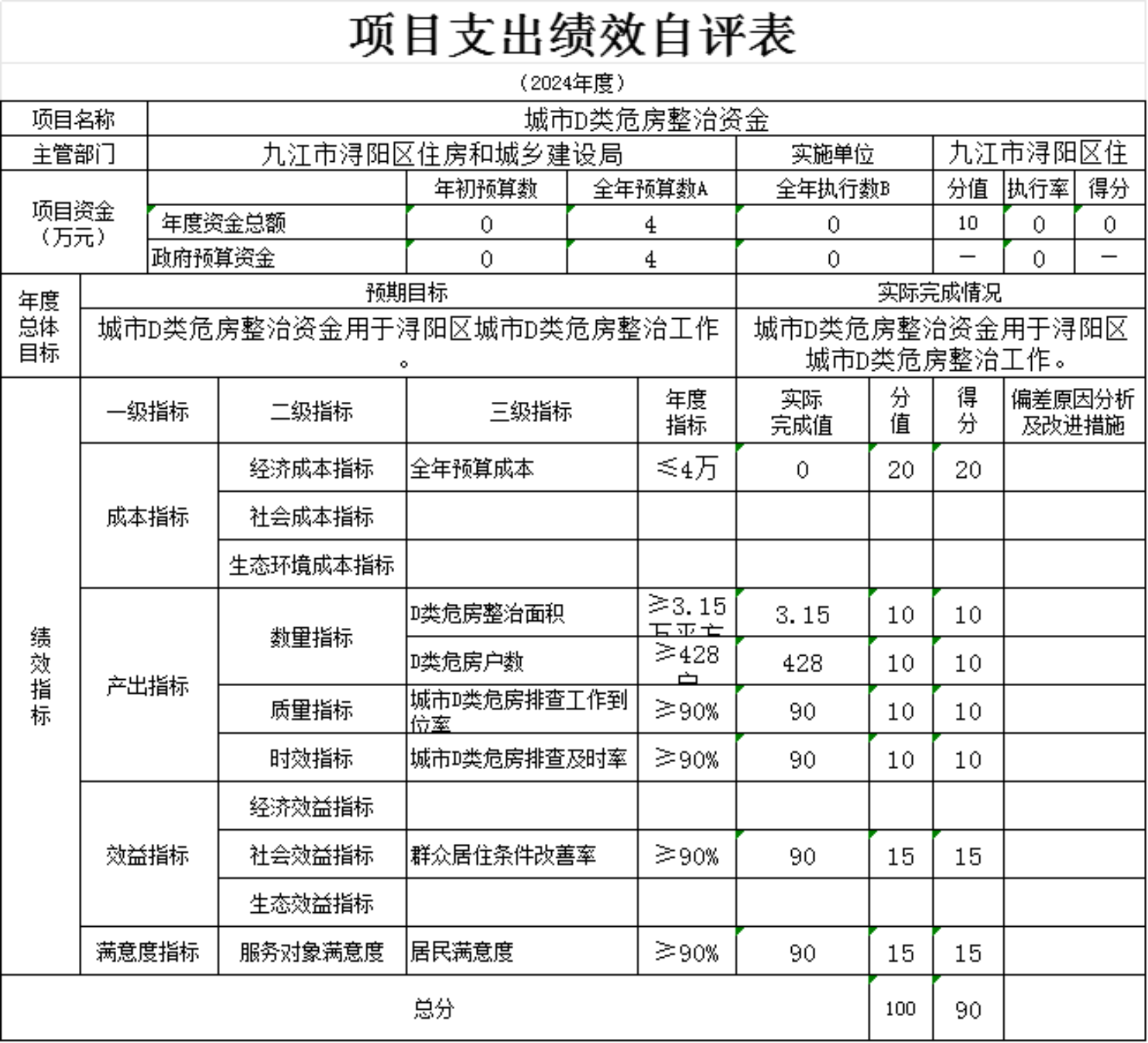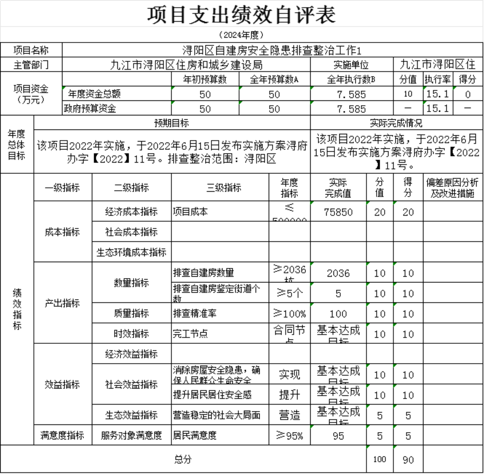 为贯彻落实中央、省、市关于全面实施预算绩效管理的要求,加强区预算绩效管理,提高财政资金使用效益,根据江西省财政厅关于印发《江西省省级项目支出和部门整体支出绩效评价管理暂行办法》的通知(赣财绩〔2022〕9号)、中共浔阳区委 浔阳区政府印发<浔阳区关于全面实施预算绩效管理的实施办法>》(浔发〔2020〕5号)等文件精神,对本单位棚改安置房房改补差款项目支出进行了绩效自评,现将自评情况报告如下: