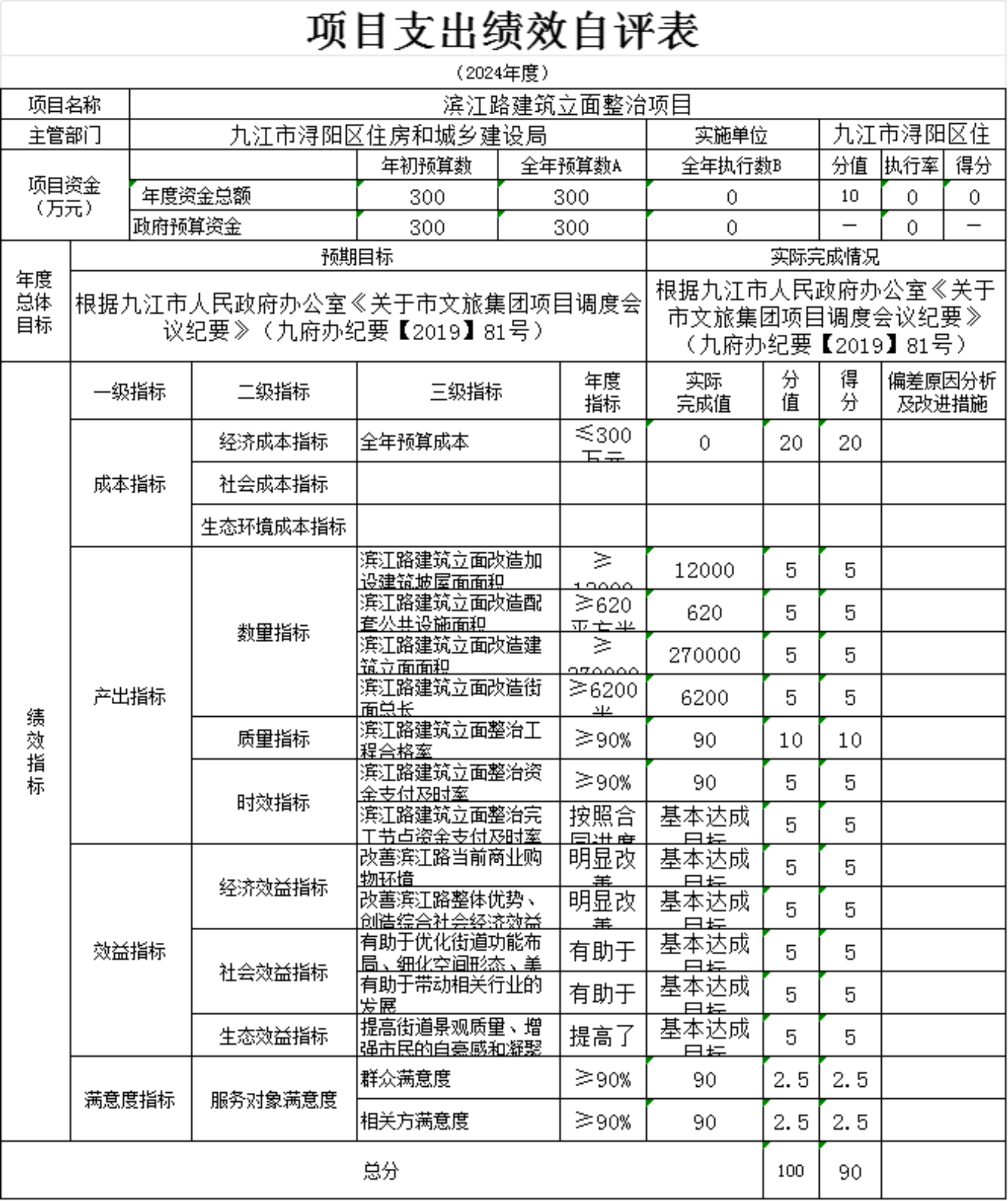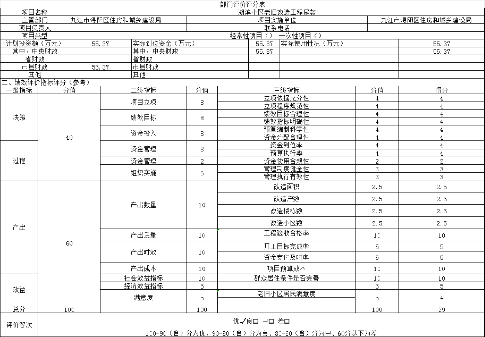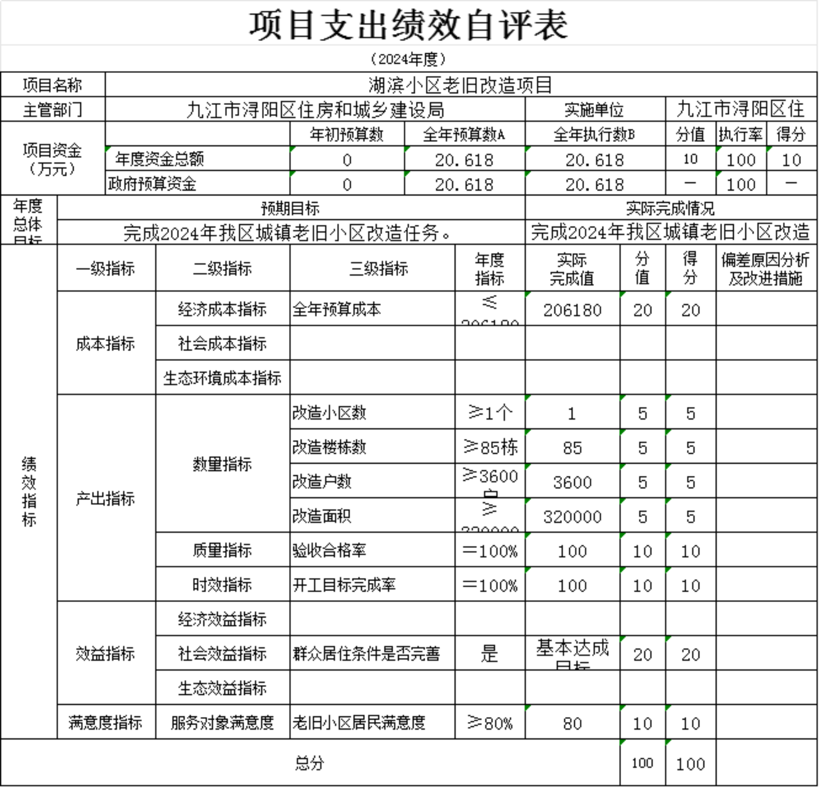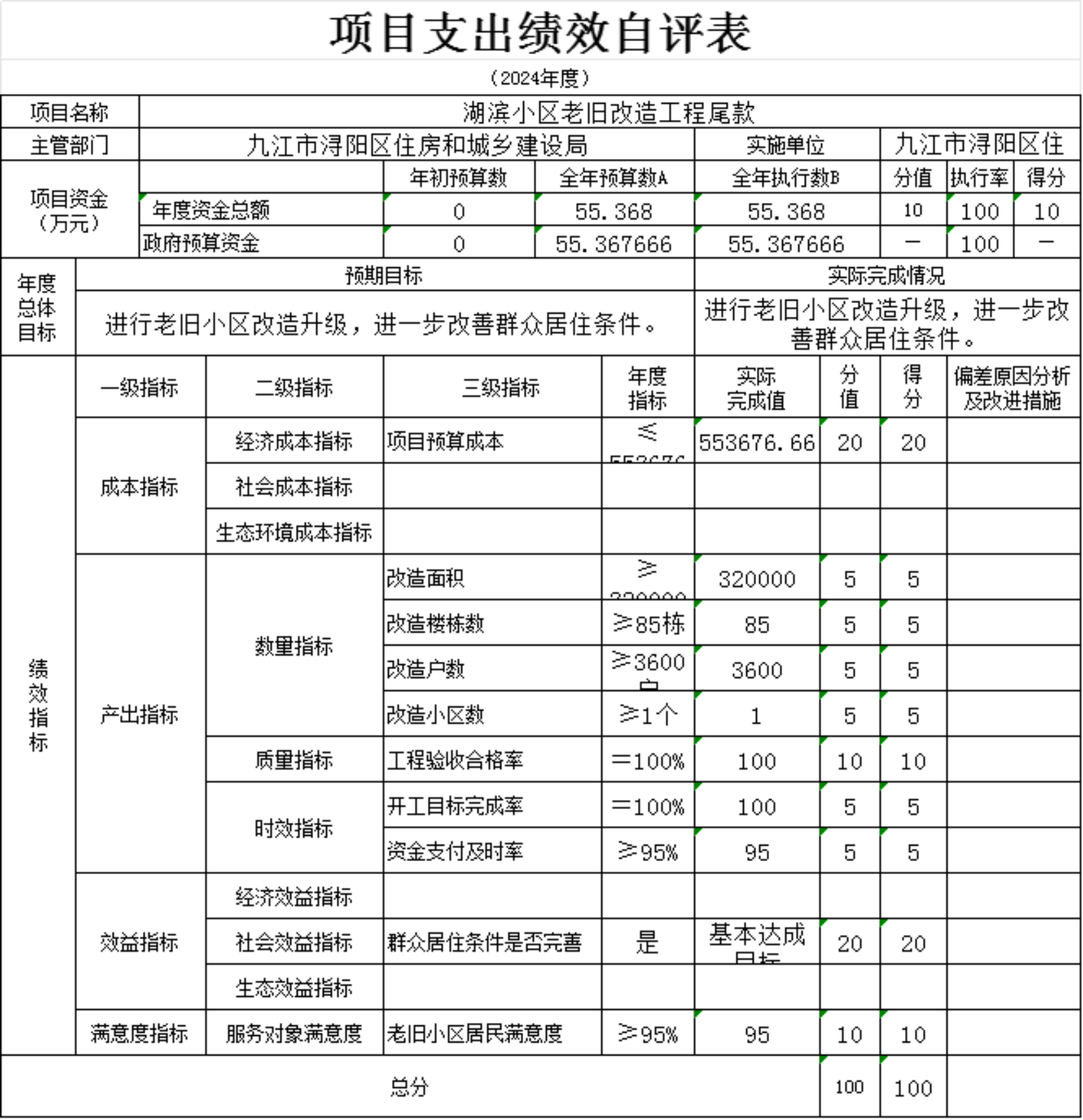 为贯彻落实中央、省、市关于全面实施预算绩效管理的要求,加强区预算绩效管理,提高财政资金使用效益,根据江西省财政厅关于印发《江西省省级项目支出和部门整体支出绩效评价管理暂行办法》的通知(赣财绩〔2022〕9号)、中共浔阳区委 浔阳区政府印发<浔阳区关于全面实施预算绩效管理的实施办法>》(浔发〔2020〕5号)等文件精神,对本单位湖滨小区老旧改造工程尾款项目支出进行了绩效自评,现将自评情况报告如下: