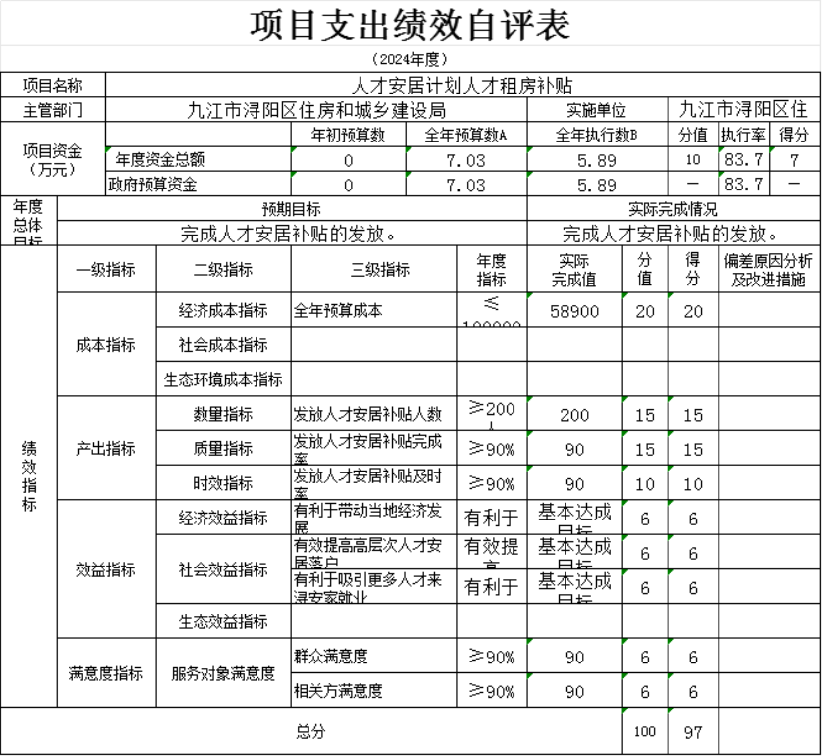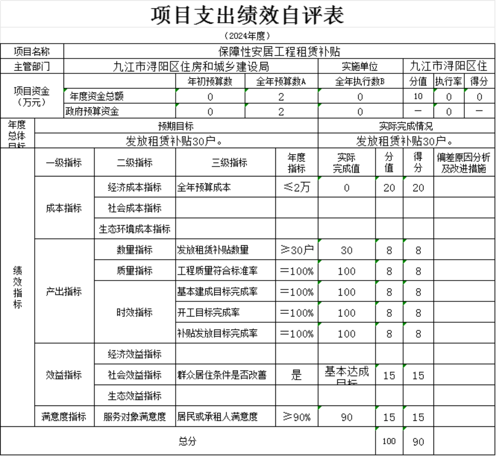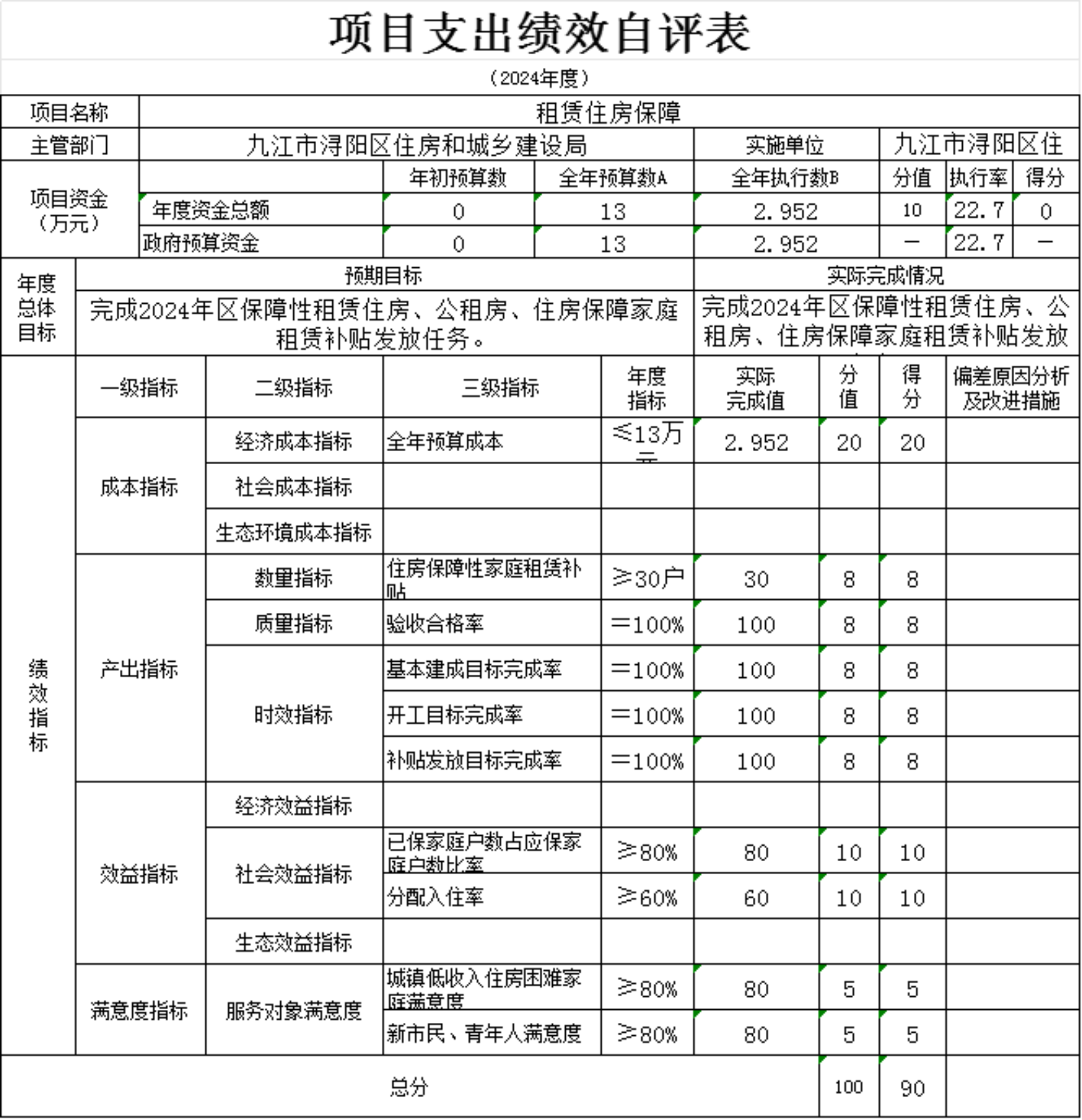 1.数量指标。本项满分10分,得分10分,全面完成了住房保障性家庭租赁补贴。