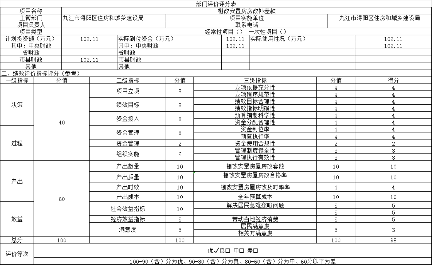 项目范围:棚改安置房房改补差款项目专项资金的完成情况,项目资金的投入及运行情况,项目实施后产生的绩效情况。
