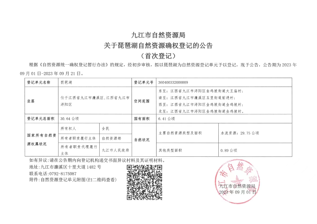 九江市自然资源局关于琵琶湖自然资源确权登记的公告(首次登记)