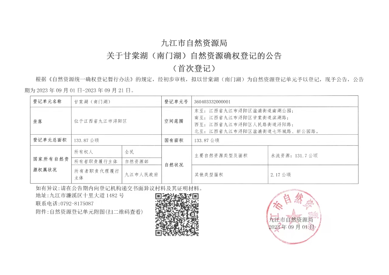 九江市自然资源局关于甘棠湖(南门湖)自然资源确权登记公告(首次登记)