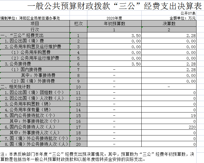 (三)“三公”经费支出:指用一般公共预算财政拨款安排的因公出国(境)费、公务用车购置及运行维护费和公务接待费。其中,因公出国(境)费反映单位公务出国(境)的国际旅费、国外城市间交通费、住宿费、伙食费、培训费、公杂费等支出;公务用车购置及运行维护费反映单位公务用车车辆购置支出(含车辆购置税、牌照费),按规定保留的公务用车燃料费、维修费、过桥过路费、保险费、安全奖励费用等支出;公务接待费反映单位按规定开支的各类公务接待(含外宾接待)支出。