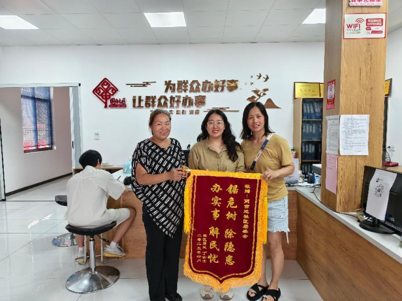 6 月 16 日,两亩地社区新村大道一支巷居民丁女士将一面“锯危树除隐患、办实事解民忧”的锦旗送到两亩地社区,感谢社区为他们解决了家门口的“绿色烦恼”。