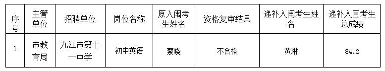 按照《2018年九江市市直学校面向社会公开招聘高层次人才及急需人才公告》要求,招聘工作已进入到资格复审及体检环节。对已通过资格复审入闱体检的考生统一组织体检。现将递补资格复审及体检有关事项公告如下: