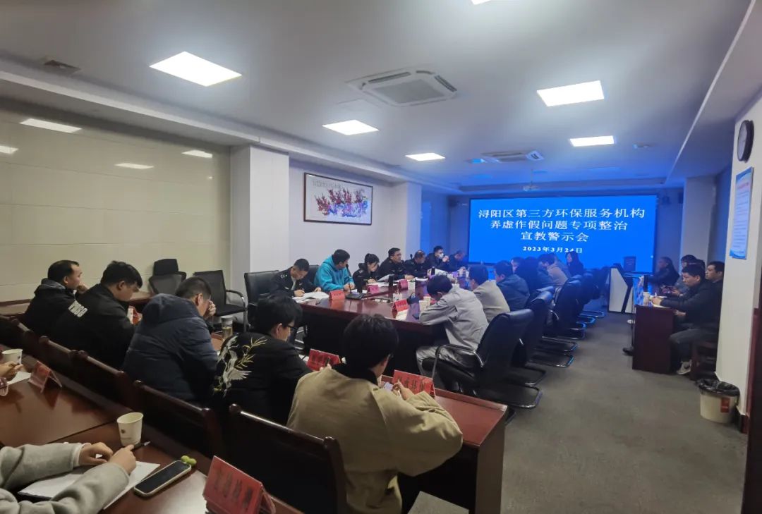 会上学习了九江市浔阳生态环境局、区市场监督管理局、市公安局浔阳区分局、区人民检察院、区人民法院联合发文的《浔阳区第三方环保服务机构弄虚作假问题专项整治行动工作方案》,通报了湖北省公布的5起第三方环保服务机构弄虚作假典型案例。