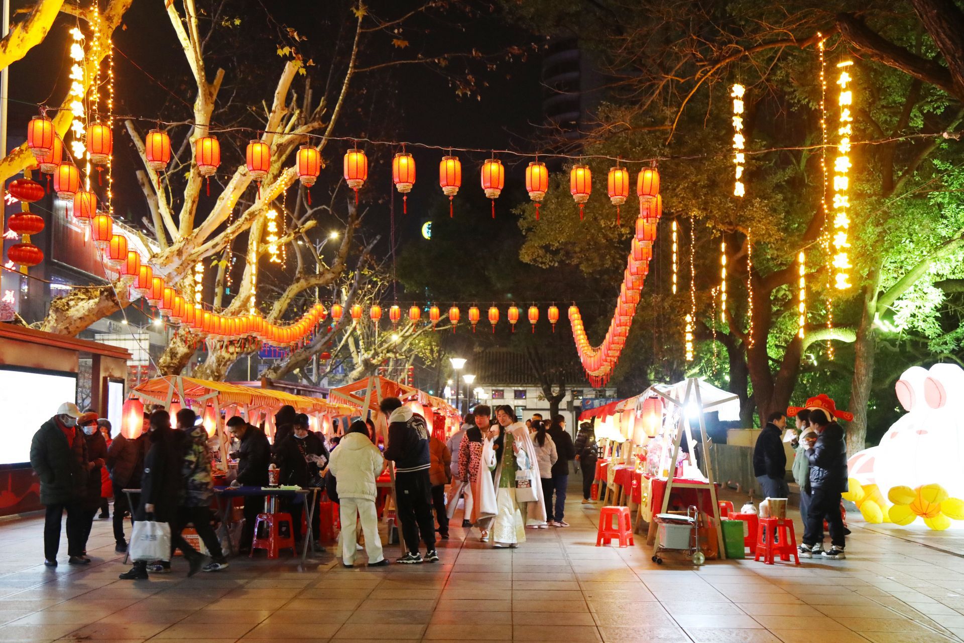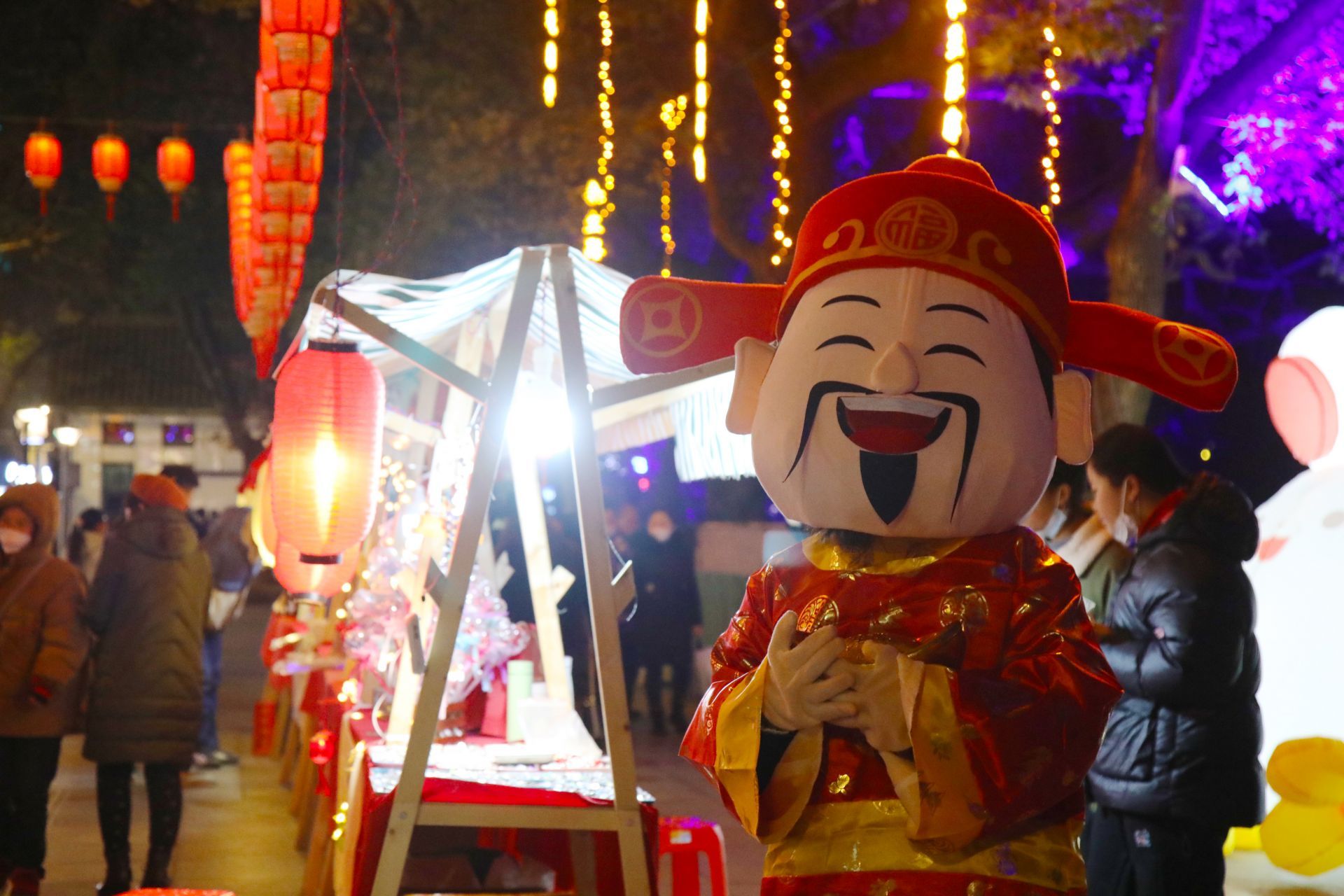 一来到烟水亭门前,就与热腾腾的新春撞个满怀,树枝上挂满了喜庆的灯笼,造型各异的“兔子”遍布市集各处,还有憨态可掬的“财神”形象吸引人们拍照合影。小吃、饮品、精美饰品让市民应接不暇,约上两三伙伴同行,慢品人间烟火,岁月清欢,拍照选购两不耽误。